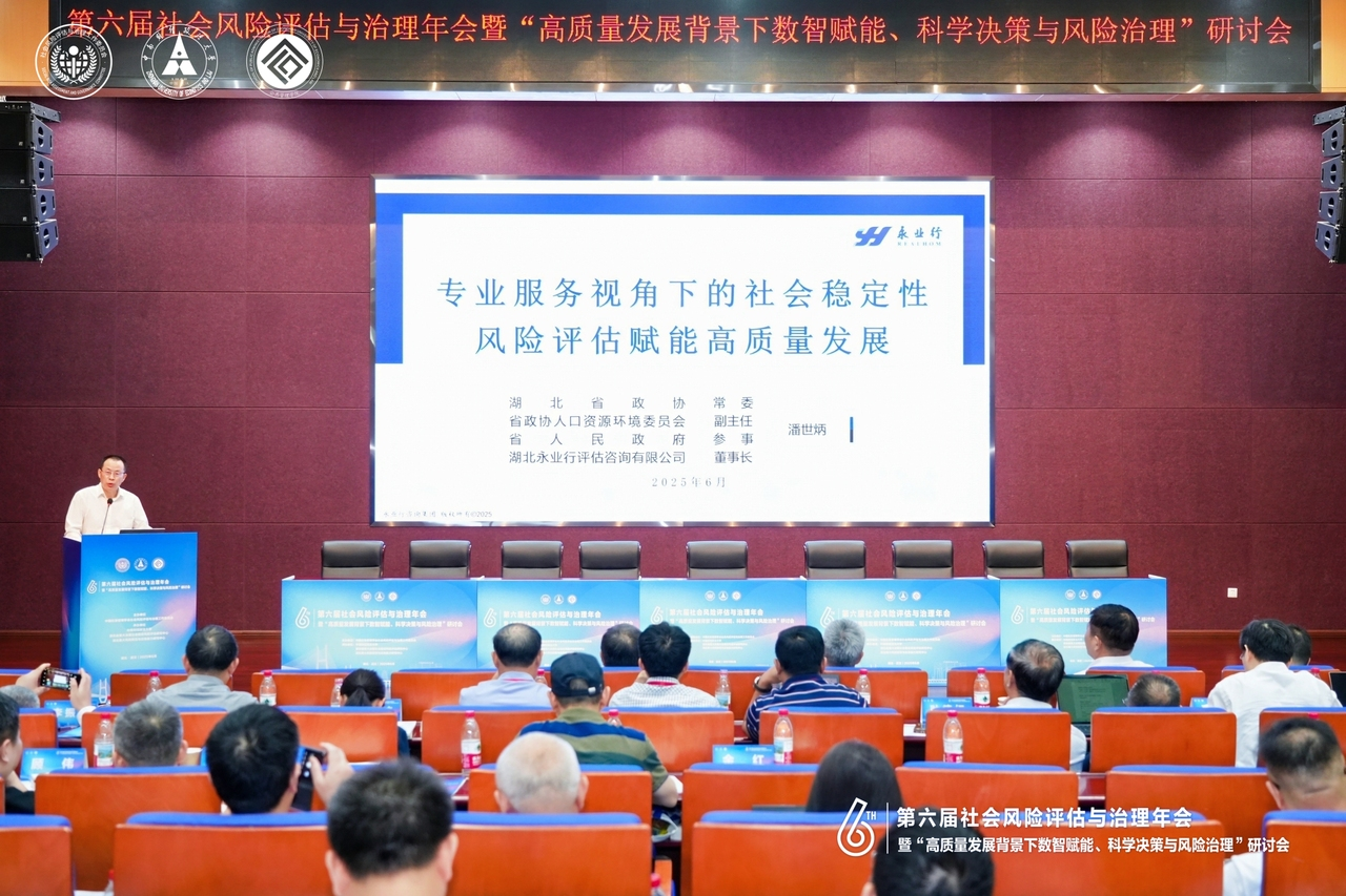 第十三届全国政协委员、原中央防范办副主任、中国应急管理学会副会长徐海斌,中南财经政法大学党委副书记、纪委书记申祖武,湖北省委政法委副书记陈实出席开幕式并致辞。中国应急管理学会社会风险评估与治理工作委员会主任委员孔祥涛主持开幕式。湖北省政协常委、人资环专委会副主任、湖北省政府参事、永业行党委书记、董事长潘世炳应邀出席会议,并作题为《专业服务视角下的社会稳定性风险评估赋能高质量发展》的主旨报告。